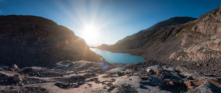 Panoramic View of Vibrant Colorful Glacier Lake up in Rocky Mountains in Canadian Nature Landscape. Sunny Summer Sunset. Wedgemount Lake Hike in Whistler, British Columbia, Canada. Background Panorama