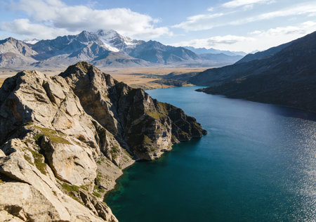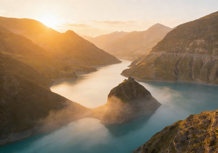 A wide-angle view of a dam and its reservoir, showcasing the natural landscape, with mountains in the background and the water glistening in the sunlight