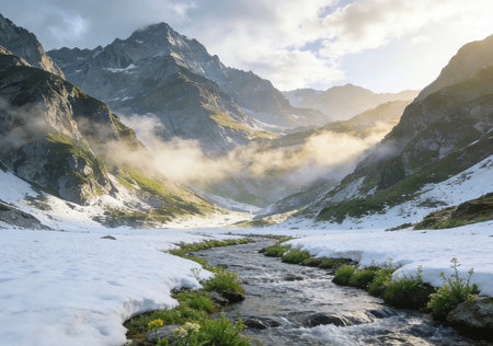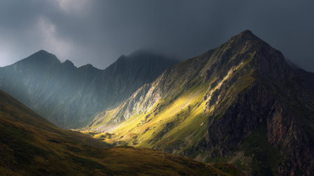 Experience the captivating beauty of a mountain landscape where sunlight breaks through clouds, illuminating vibrant green slopes amidst dramatic peaks.