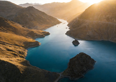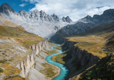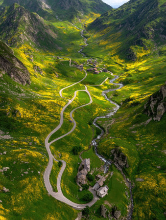 An overhead shot reveals a winding road navigating a verdant valley flanked by towering mountains. The scene showcases vibrant greens and yellows, suggesting a daytime setting with abundant sunlight. This visual could be utilized for travel, nature, or environmental themes in various commercial and editorial contexts.
