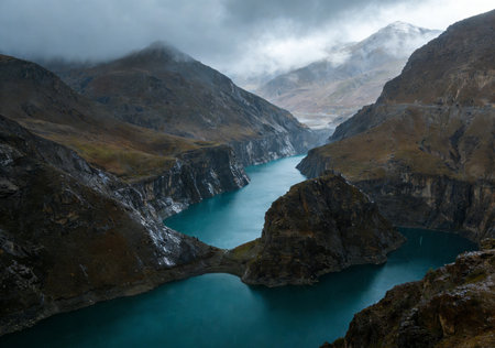 Blue lake at cloudy rainy day. Cold landscape of Imeretinsky Lake of silence in Karachay-Cherkess, Russia