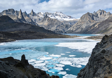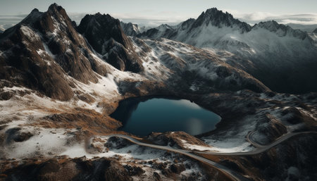Majestic mountain range, frozen in tranquil beauty generated by artificial intelligence