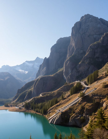 The snowy peaks of Stelvio Pass rise majestically, with winding roads weaving through the alpine terrain beneath a clear blue sky, showing Lombardy's stunning beauty.