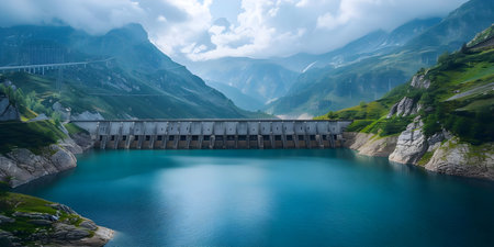 Scenic dam with water flowing through turbines, with mountains in background promoting green energy