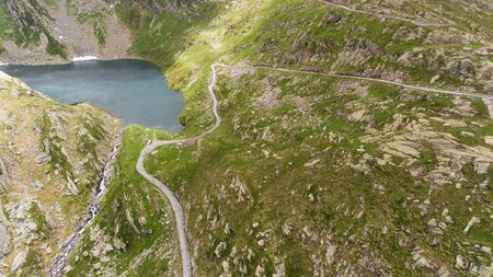 Aerial view of an old road going through the St. Gotthard pass in the Swiss Alps