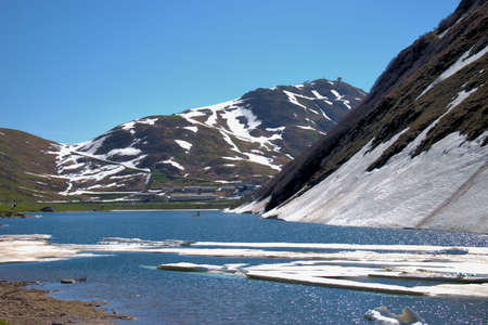 Ice is drifting on the lake on top of the Oberalppass in Switzerland 21.5.2020