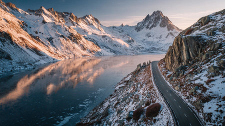 Snow-covered mountains surround a winding road by a frozen lake during sunset in a remote location
