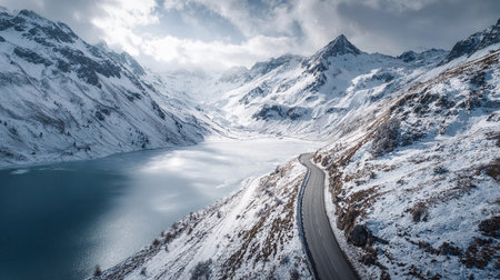Scenic view of a winding road by a snowy mountain lake surrounded by tall peaks on a cloudy day