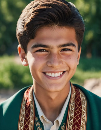 A smiling Tajik boy 5 years old beams with happiness, enjoying the beauty of a sunny day outdoors. His cheerful expression reflects moment of pure joy and innocence. Happy smiling child. AI generated.