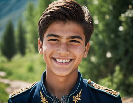A joyful cute Tajik boy 18 years old beams with happiness as he stands in a picturesque landscape, surrounded by nature's beauty during warm, golden hour light. Happy smiling brunette boy. AI generate