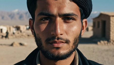 A young man 25 years old from Afghanistan, wearing traditional clothing, poses proudly in his village with mountains in the background, showcasing his cultural heritage. Generative AI.