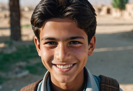 A young man from Afghanistan beams with a cheerful smile, basking in the warm sunlight. He stands in a rural area, showcasing the beauty of his homeland with joy and pride. Generative AI.