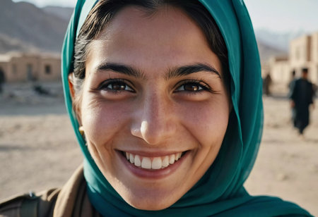 A woman from Afghanistan beams with joy, showcasing her warm smile. Dressed in traditional attire, she represents the vibrant culture of her community, radiating positivity. Generative AI.