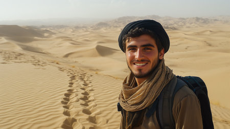 Generative AI Image of Islamic Arabian Man Wearing Turban Smiling in Desert View on Sunny Day