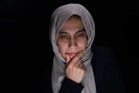 Woman gazes gently at the camera wearing a dark headscarf. Her expression is serene, with soft lighting enhancing her features. Subtle makeup highlights her natural beauty