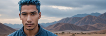 Midshot Portrait Photo Of A Gloomy Handsome Male Model With A Blue Hair Isolated On A Peru Background With Copy Space, Banner Template. Generative AI