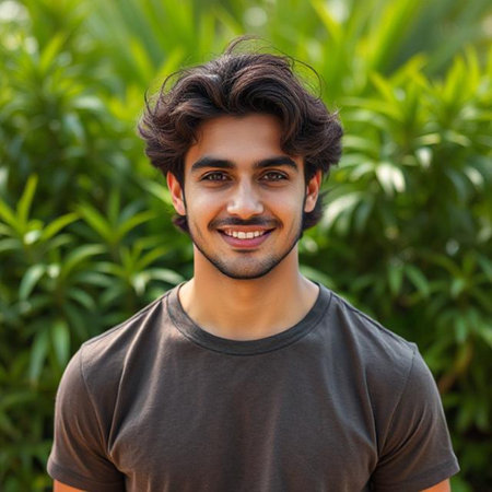 Portrait of a young Indian man smiling at the camera outdoors.