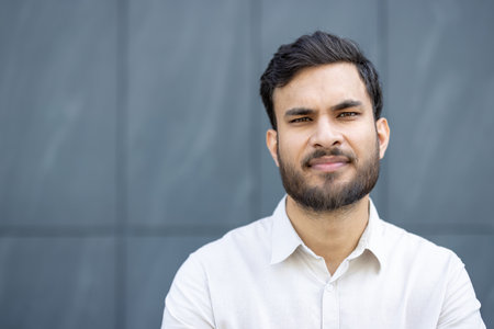 A handsome man of Indian ethnicity stands confidently, posing in front of a modern, textured, and gray building.