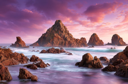 Rugged cliffs and rock formations emerge from serene ocean at dusk, under vibrant, painted skies