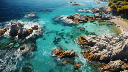 Drone capture of a rugged shoreline and sparkling sea, showcasing a summer destination with vibrant coastal landscapes.