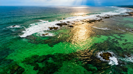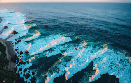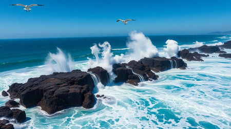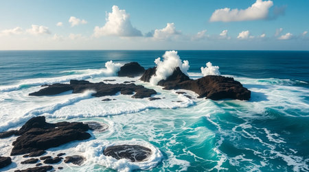 Captivating aerial image showcasing dynamic ocean waves as they crash against rugged rocks, creating foam and stunning textures in a vibrant seascape.