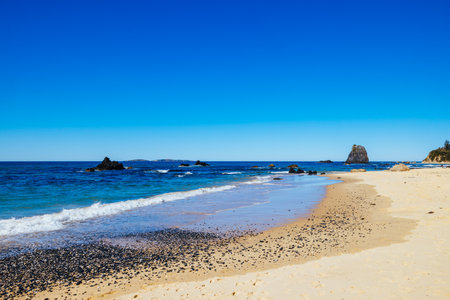 Ocean waves with white foam and sandy beach on a sunny day. Nature tropical paradise background. Tuross Head, NSW, Australia