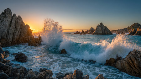 Majestic coastline, breaking waves, rocky cliffs, beauty in nature generated by artificial intelligence