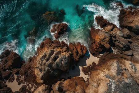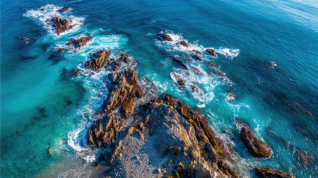 An aerial shot showcases a rugged coastline where vibrant turquoise waves surge against dark, textured rocks. The composition displays dynamic patterns of water and stone with overhead lighting. Suitable for environmental themes, it provides a visual for travel, nature, and coastal projects, offering versatile applications.