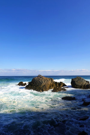 Ocean waves breaking on beatiful rugged rocks on the beach on bright sunny day