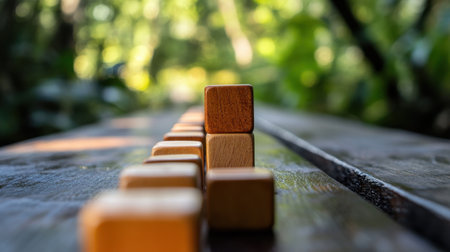 A creative arrangement of wooden blocks stacked in increasing order symbolizes growth and progression in a serene, softly blurred natural environment.