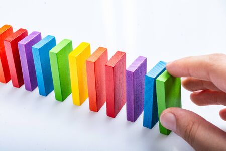 Colorful dominoes. Rainbow colored chain reaction.
