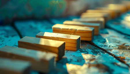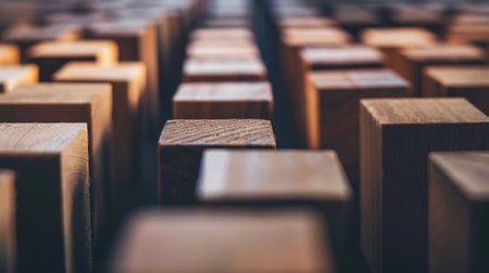 A captivating arrangement of wooden blocks in a straight line against a black background, showcasing the interplay of shadow and light, ideal for abstract art themes.