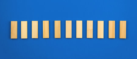 A close-up, low-angle view of a line of light brown wooden dominoes standing on their edges, poised for a chain reaction.
