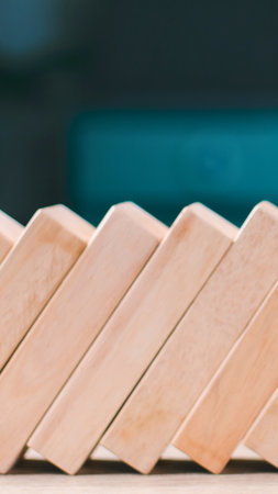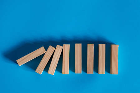Wooden pieces domino effect stopping with stand wooden pieces. Concept: Business crisis and risk protection concept.