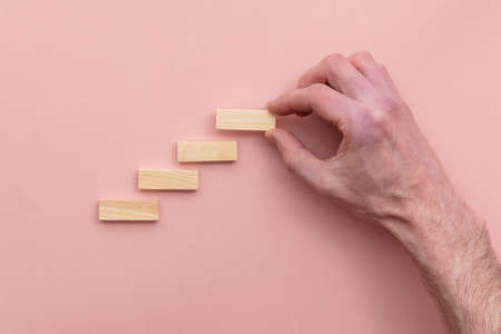 Human hand arranging wooden blocks stacking as step stair. Business growth and success concept.