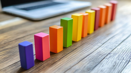 A vibrant arrangement of colorful blocks on a wooden table symbolizes growth and progress. The image captures creativity and strategy in a business or educational environment.