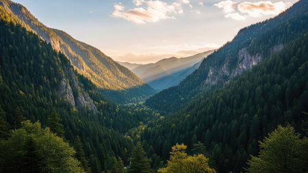 Explore a stunning mountain valley nestled between lofty peaks, illuminated by soft sunlight under a dramatic sky, showcasing the beauty of untouched wilderness.