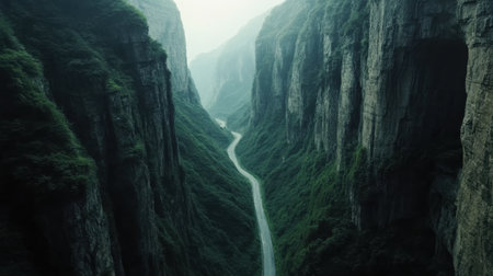 A long road ascends through a stunning gorge, flanked by steep cliffs and vibrant greenery. The dramatic landscape showcases nature's beauty and serenity, evoking a sense of adventure.