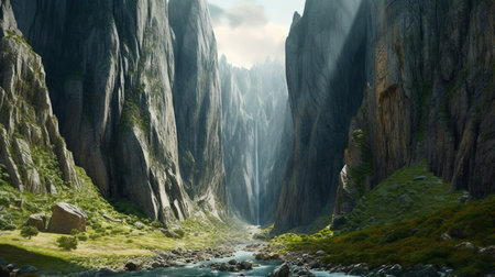 A hidden valley surrounded by towering cliffs that seem to stretch up to the sky. The valley is lush with vegetation, with a small stream winding its way through the center.
