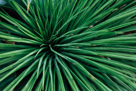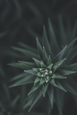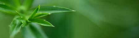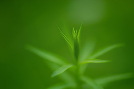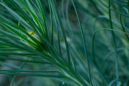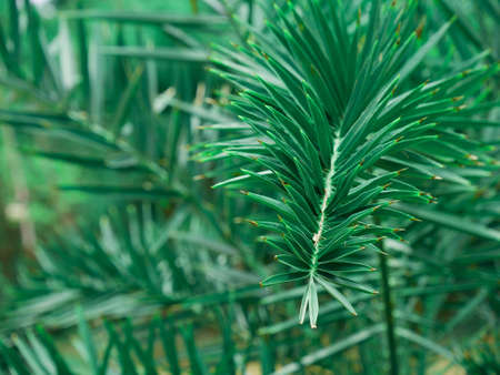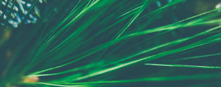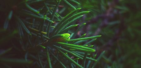Fine fir growing on young coniferous tree, closeup shallow depth of field macro detail - only few blades in focus, abstract natural background space for text left side