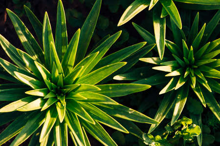Green leaves of lilies in the sun's rays. View from above. Leaves in the form of asterisks.