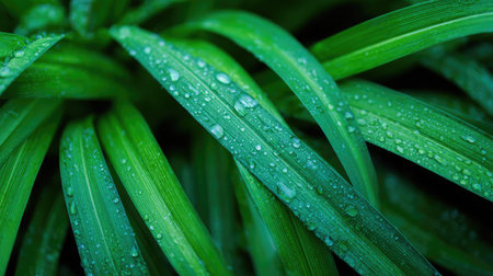 A close-up view of lush green leaves adorned with glistening water droplets, showcasing the freshness and vibrant beauty of nature in an outdoor setting.