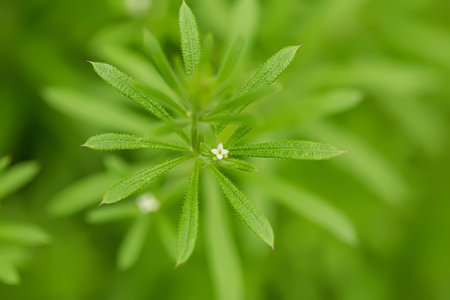 White small flowers on Galium aparine cleavers, clivers, goosegrass, catchweed, stickyweed, robin-run-the-hedge, sticky willy, sticky willow, stickyjack, stickeljack, and grip grass close-up In the spring.