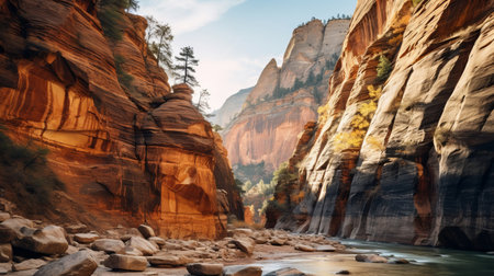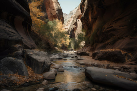 majestic and serene canyon, with a tranquil stream flowing through it, created with generative ai