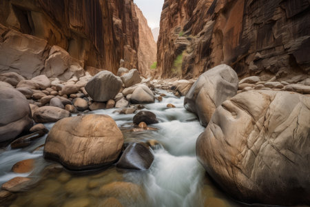 boulders, rock formations and rushing water in a canyon, created with generative ai