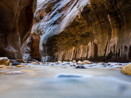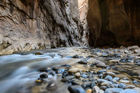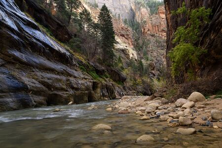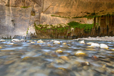The Virgin River weaves its way through the spectacular and stunning Narrows, Zion National Park, USA nobody in the image