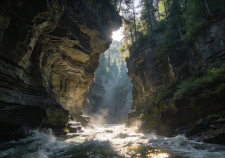 Wide river flowing rapidly through a deep canyon, bordered by steep, rugged rock walls and scattered evergreen trees. sunlight illuminates the natural landscape.