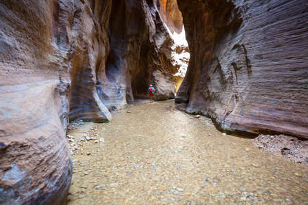 Hiking in Zion National Park in Utah, USA. The canyon is composed of layers of basaltic and travertine sandstone.