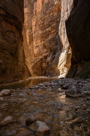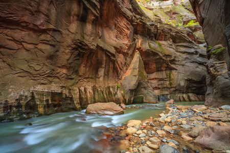 beautiful landscape of the Narrows in Zion National park with the virgin river flowing through the slot canyon