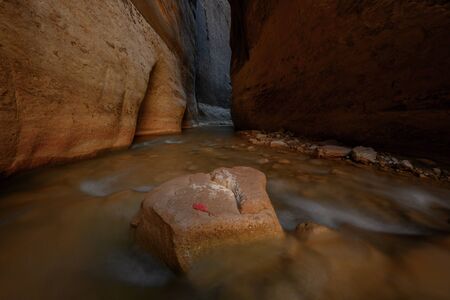 Single Leaf of Autumn On Rock In Slot Canyon of Narrows